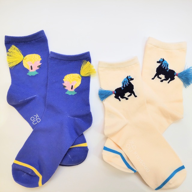「ポニーテール 刺繍ショートソックス」 見たことのない面白い柄だったり、おしゃれな柄だったり、 毎回ワクワクさせてくれる唯一無二の靴下を作られる「きびす堂」さん。 女の子とお馬さんのポニーテール靴下。 どちらも風になびいている姿がとってもキュート☆ 2026年は午年。午年生まれの方、競馬好きの方にプレゼントはいかがですか☆ ※こちらは2足セットとなります。 ※タッセル部分は強く引っ張ると外れる恐れがございますので、お取り扱いにはご注意ください。 ※裏返してクリーニングネットに入れて洗濯していただくと傷みづらくなります。 ※縮むことがありますので、タンブラー乾燥はお避け下さい。 【サイズ】 22.5~24.5cm 【カラー】 パープル&ホワイトの2足セット 【素材】 綿 ポリエステル その他