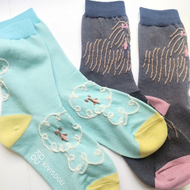 「ドローイングドッグ クルーソックス」 見たことのない面白い柄だったり、おしゃれな柄だったり、 毎回ワクワクさせてくれる唯一無二の靴下を作られる「きびす堂」さん。 こちらは落書きのような線で描かれた とても愛らしいビジョンフリーゼとヨークシャーテリア柄の靴下。 線の部分はポコポコとした凹凸で立体感があります。 ペロッと出した舌がチャームポイント☆ コーディネイトのポイントに。 足元を見るとワクワクするような靴下です。 ※こちらは2足セットとなります。 ※お洗濯の際はネットに入れていただくと傷みづらくなります。 ※縮むことがありますので、タンブラー乾燥はお避け下さい。 【サイズ】 22.5~24.5cm 【カラー】 ミントグリーン&チャコールの2足セット 【素材】 綿 ポリエステル その他