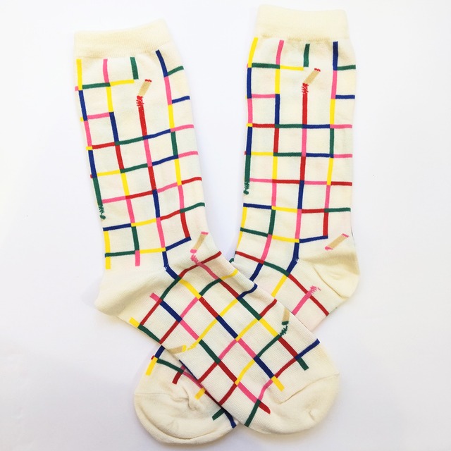 たくさんの種類の柄 -gara- と、独特な生態系を持ち進化をしたガラパゴス諸島の生物たちをオマージュした、ステーショナリーメーカーGreen Flashさんの靴下ブランド「garapago socks」です。 足元に添える「ときめき」 ステーショナリーメーカーだからこそ生み出せる、オリジナリティのあるユニークな柄は個性豊かで、見ているだけで童心に返ってワクワクしてきます。 文具を選ぶように、靴下もいろんな柄を楽しんでほしい、そんな思いを込めて作られています。 青・赤・ピンク・緑のクレヨンの線が一面に引かれた靴下。 カラフルな色使いは、まるで童心にかえるようにワクワクします。 スカートやパンツの裾からチラッと覗かせて、コーディネイトのアクセントにしてみてくださいね。 【サイズ】 22~25cm 長さ17cm 【素材】 綿・ナイロン・その他