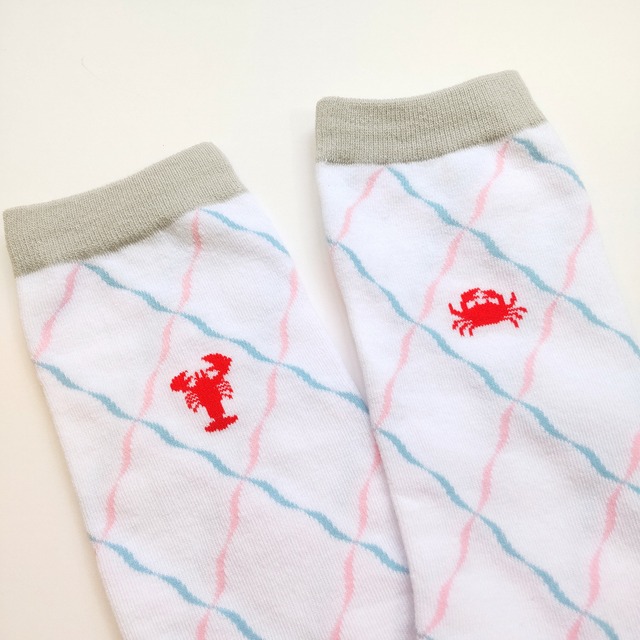 たくさんの種類の柄 -gara- と、独特な生態系を持ち進化をしたガラパゴス諸島の生物たちをオマージュした、ステーショナリーメーカーGreen Flashさんの靴下ブランド「garapago socks」です。 足元に添える「ときめき」 ステーショナリーメーカーだからこそ生み出せる、オリジナリティのあるユニークな柄は個性豊かで、見ているだけで童心に返ってワクワクしてきます。 文具を選ぶように、靴下もいろんな柄を楽しんでほしい、そんな思いを込めて作られています。 ちょこんと控えめに描かれたカニとオマール海老。 リボンの柄と相まってなんとも愛らしいです‥♡ 爽やかにワンピースやスカートなんかと合わせちゃってみてくださいね。 【サイズ】 22~25cm 長さ17cm 【素材】 綿・ナイロン・その他