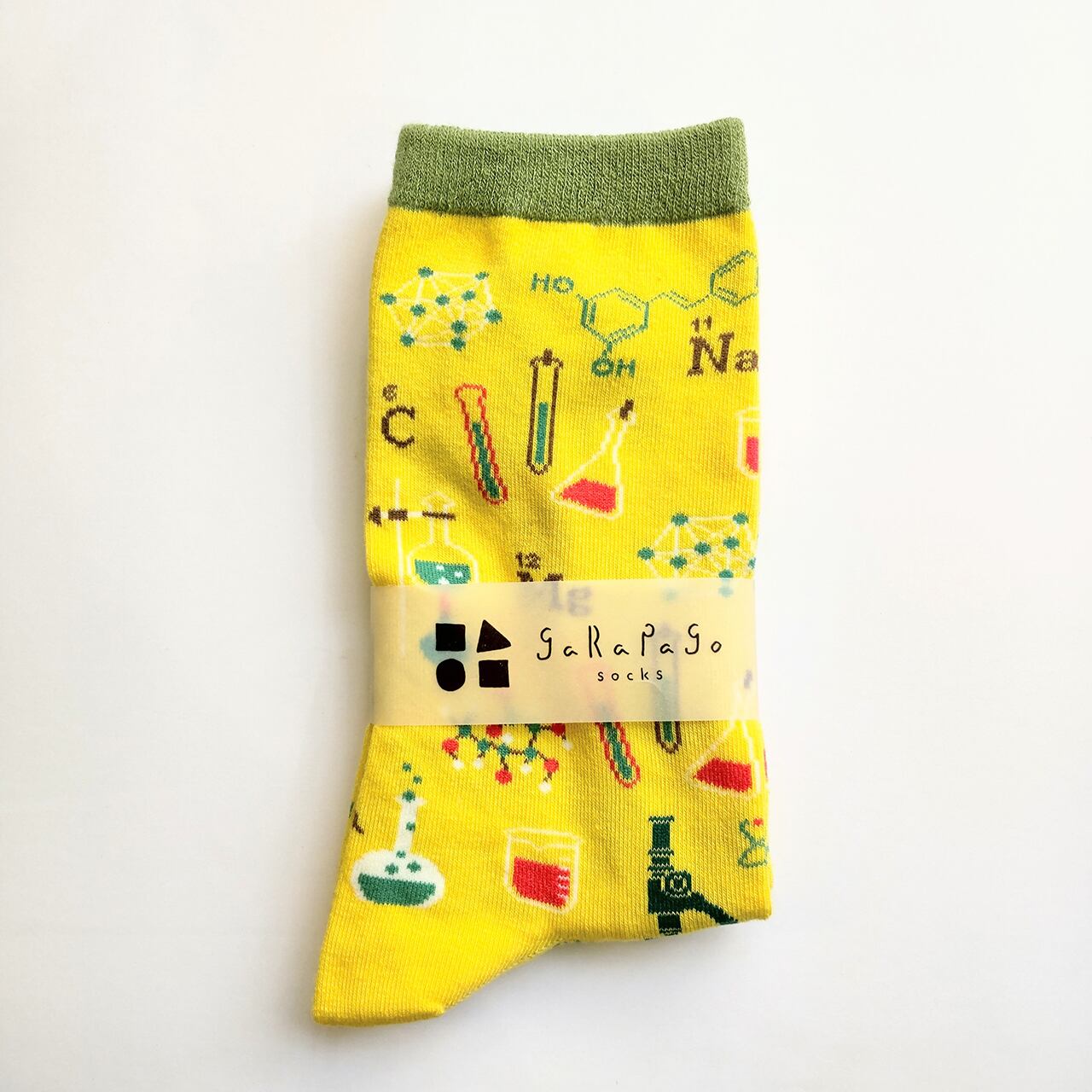 ビーカーや顕微鏡など、子供時代に理科の実験で感じたワクワクがぎゅっと詰まったような靴下。