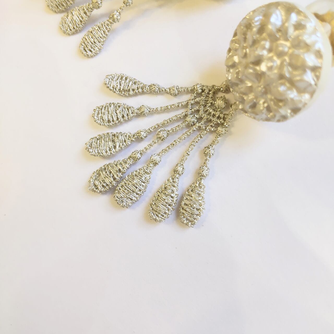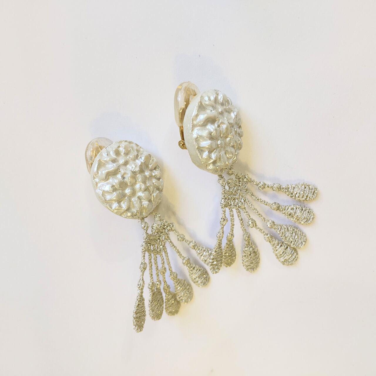 柔らかい乳白色の大ぶりなお花のモチーフとレースが、顔回りに華やかさをプラスしてくれる耳飾り。