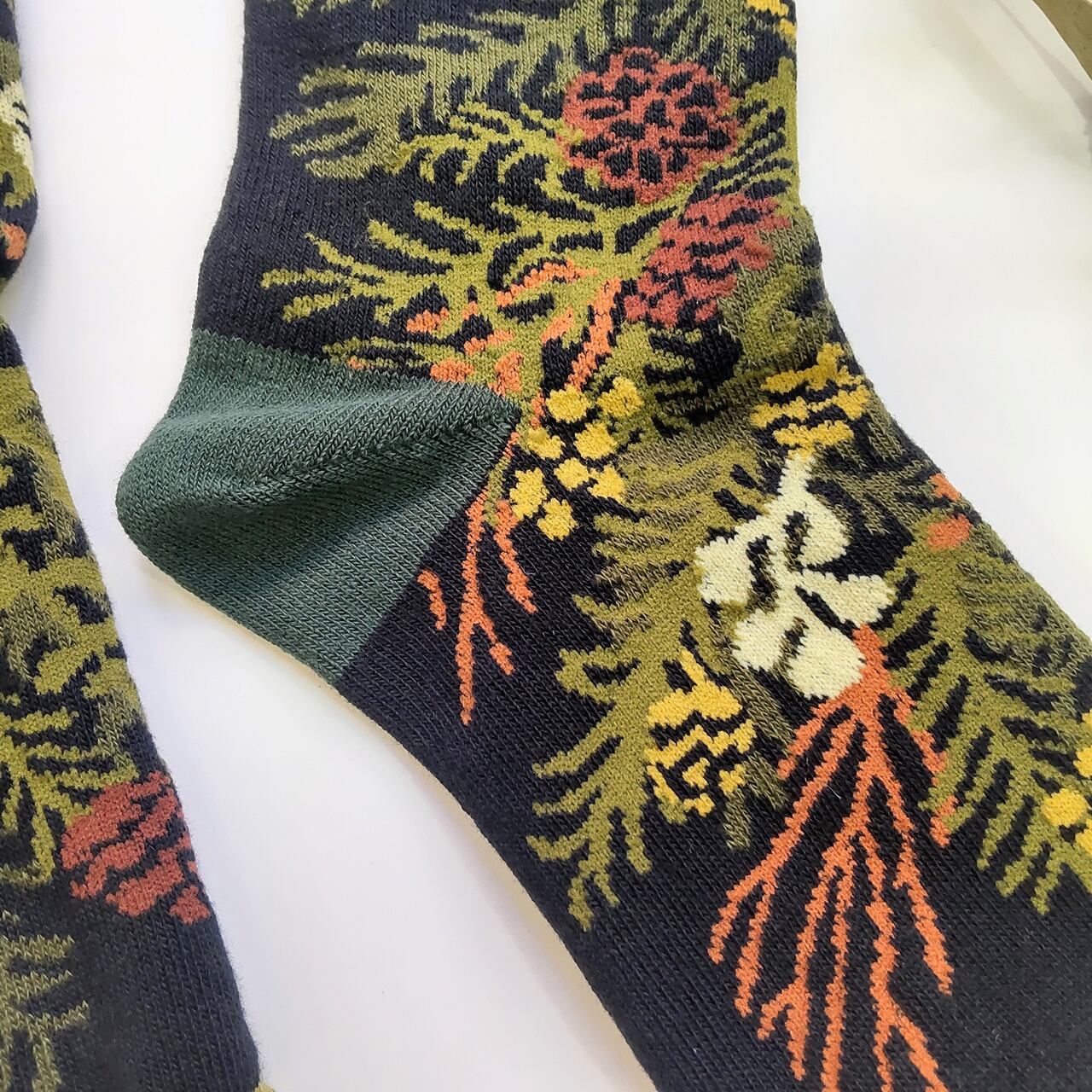 靴下では常緑樹で冬場でも緑を絶やさないことから‘永遠の命・生命力の象徴’とされるモミの木や杉、再生のシンボルのユーカリなど自然の力強さを感じる植物たちが描かれています。