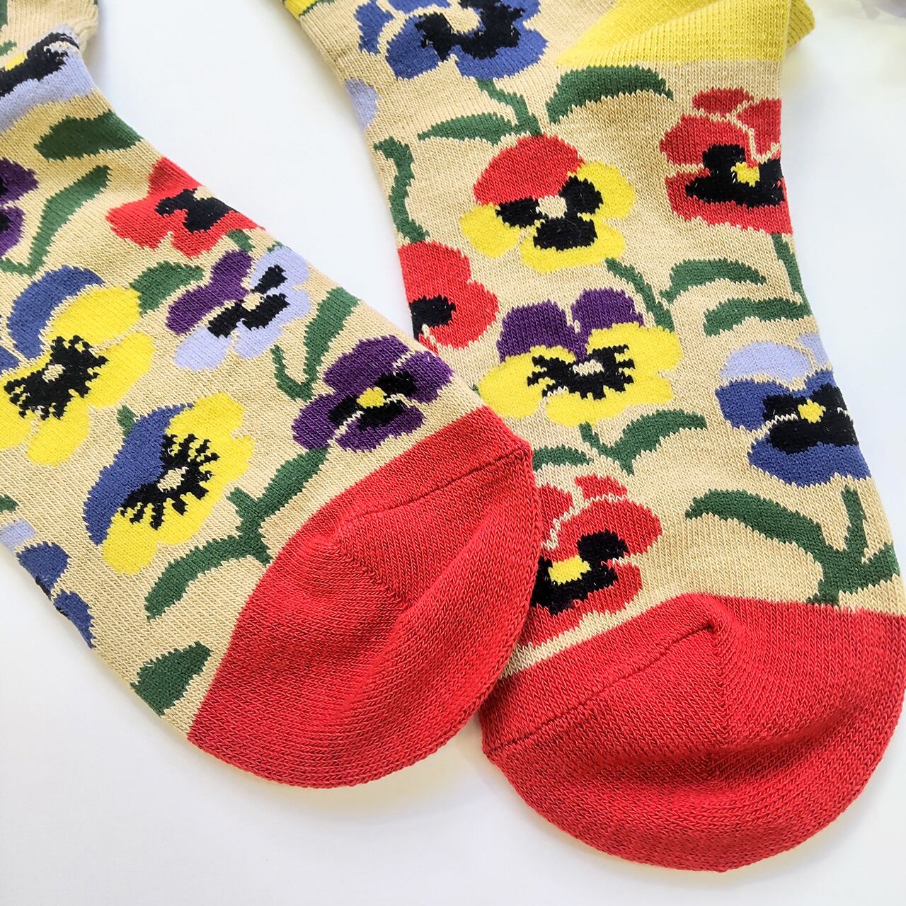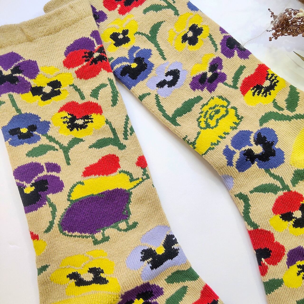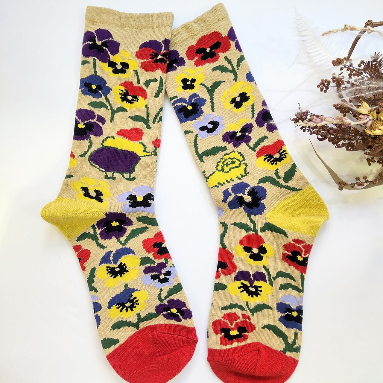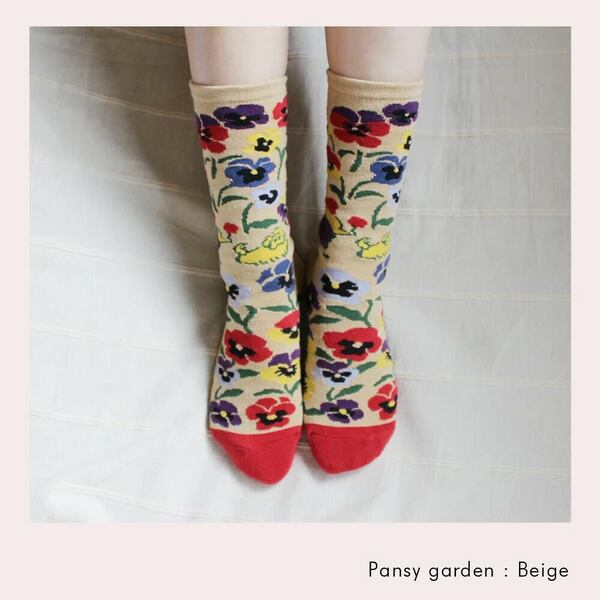 こちらはパンジーが大好きなおばあちゃんの自慢のお庭をイメージした靴下です。
