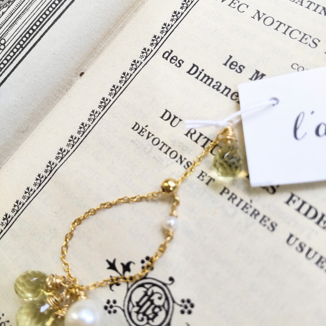 やや黄緑がかった、淡く透明感のあるシトリンのチェーンリング。
