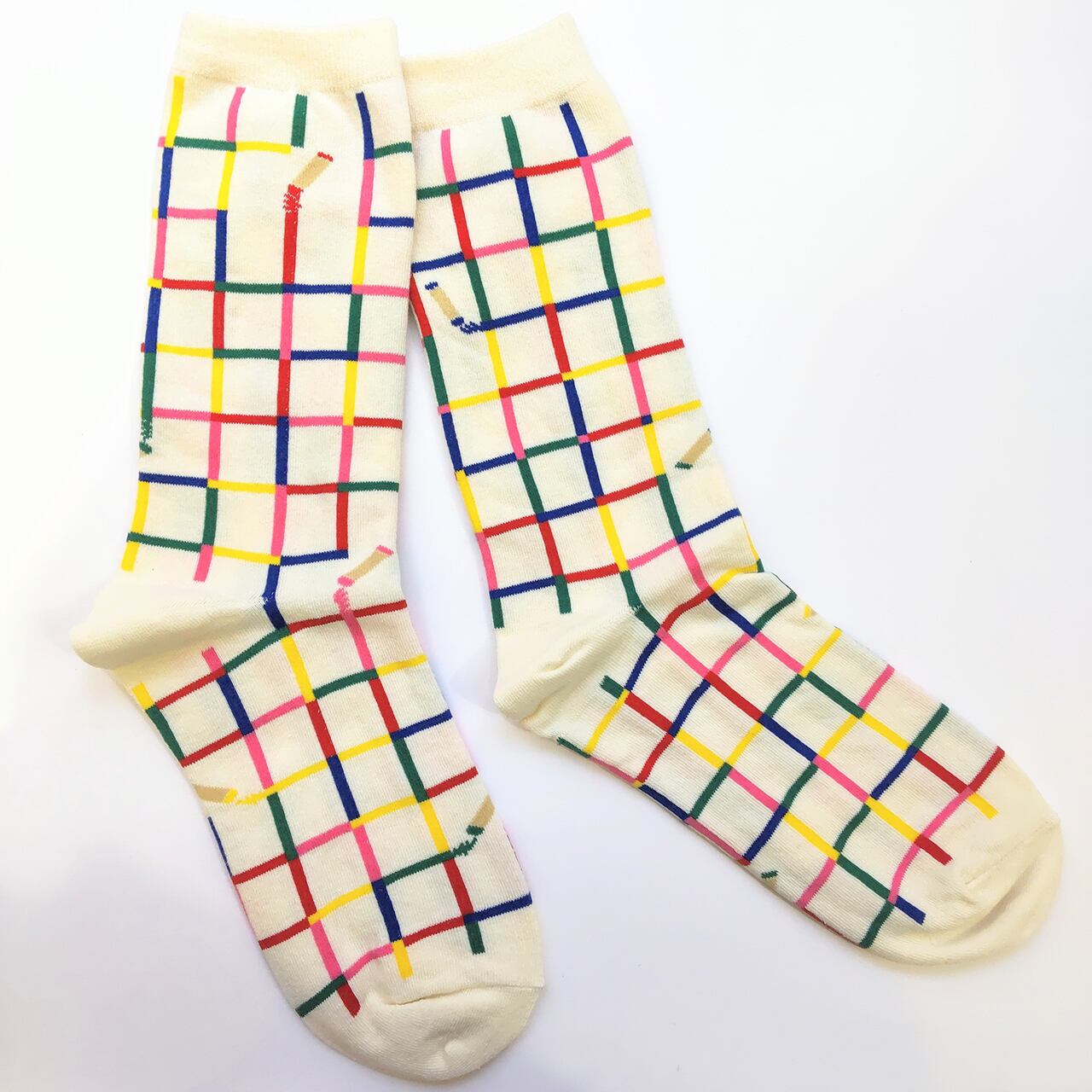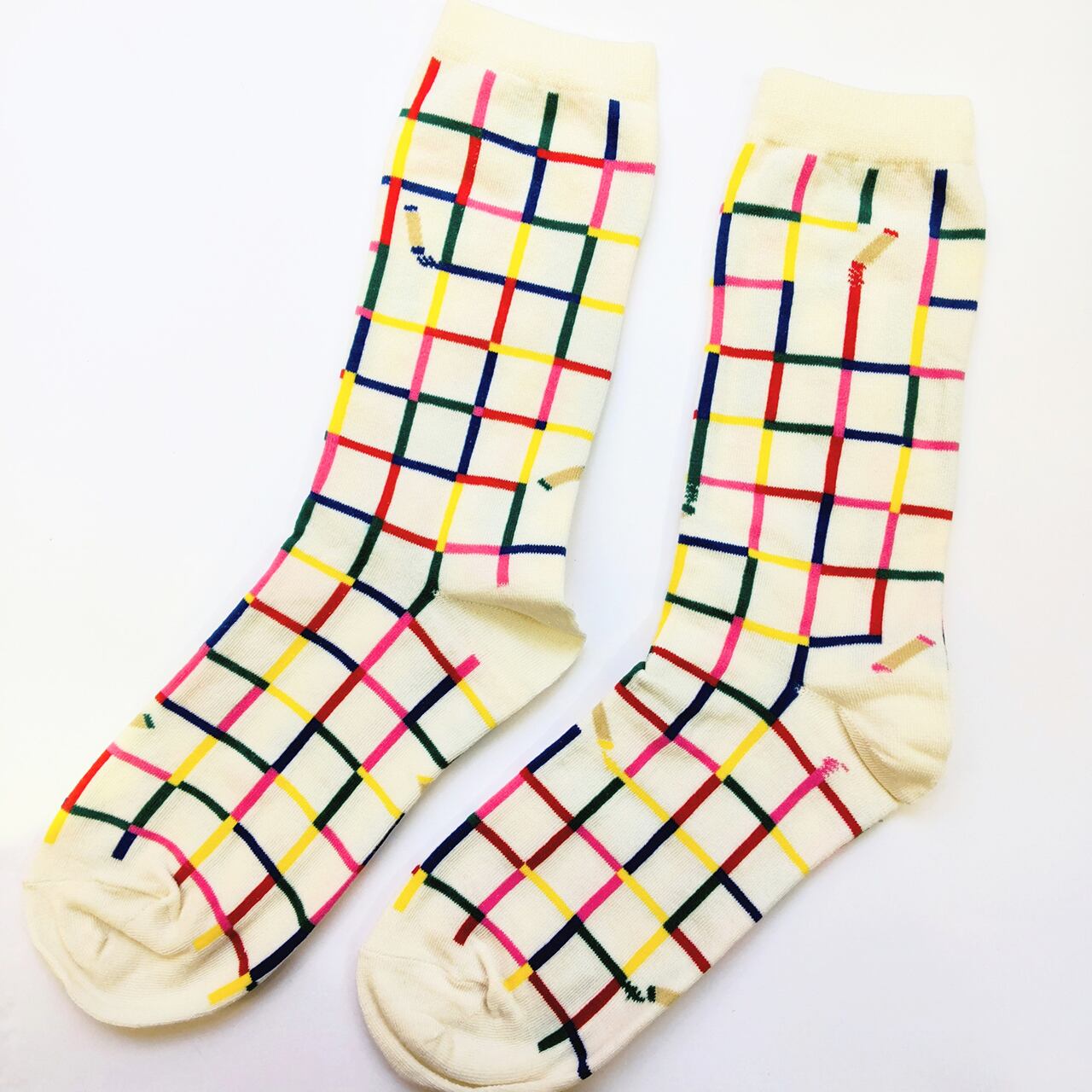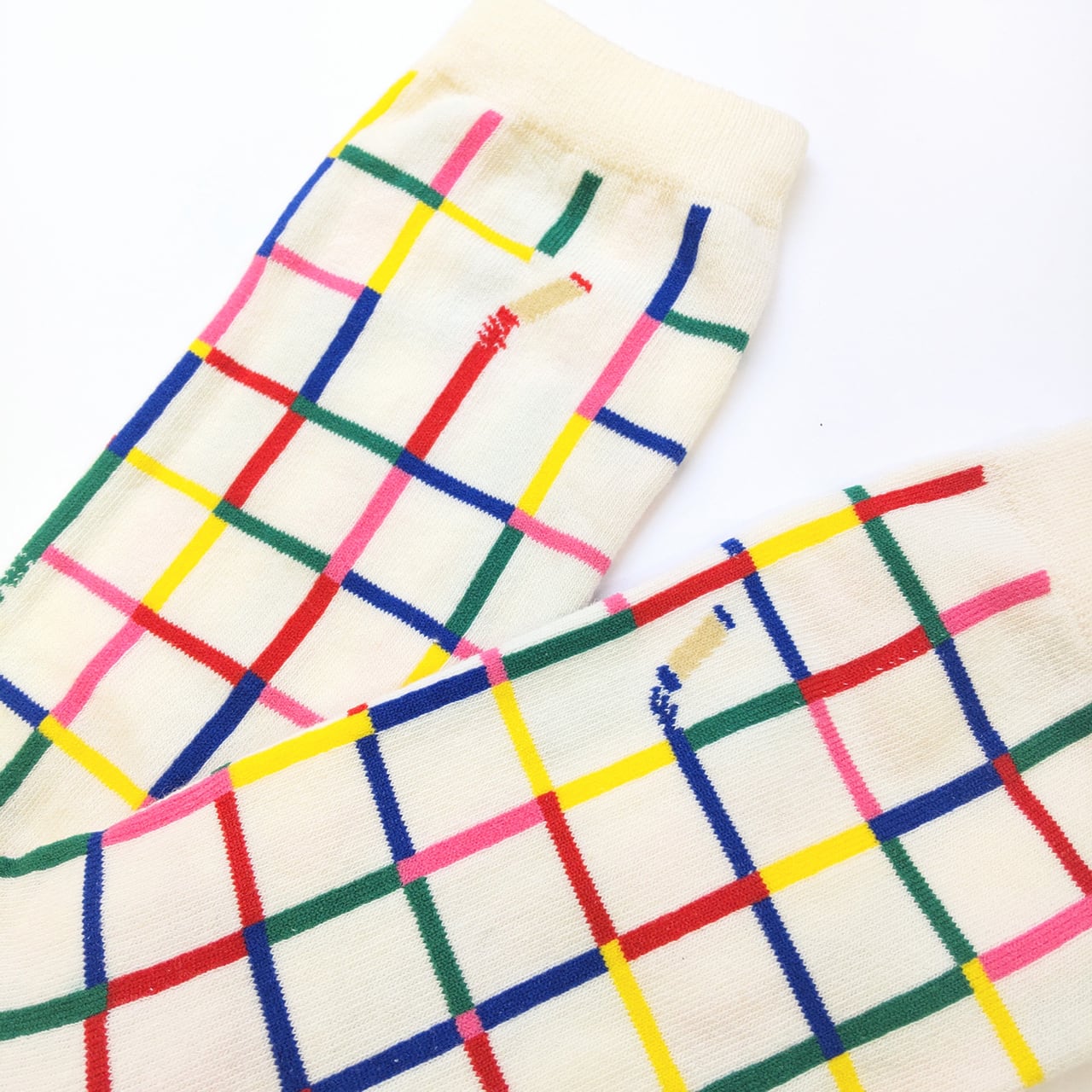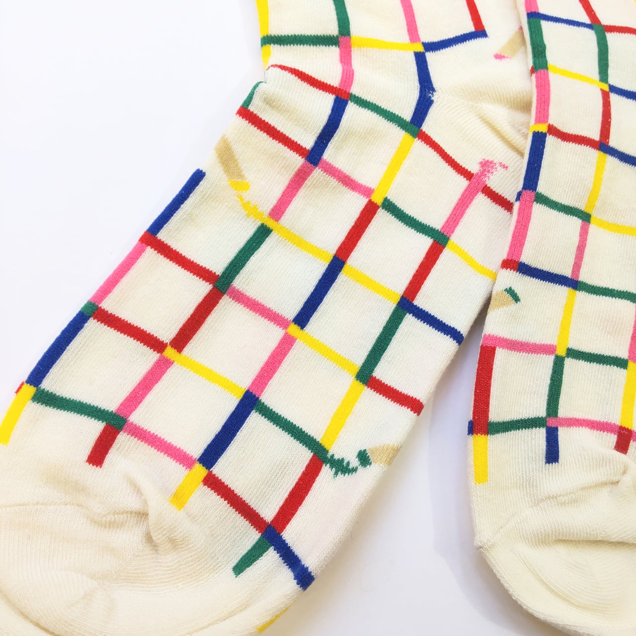 青・赤・ピンク・緑のクレヨンの線が一面に引かれた靴下。