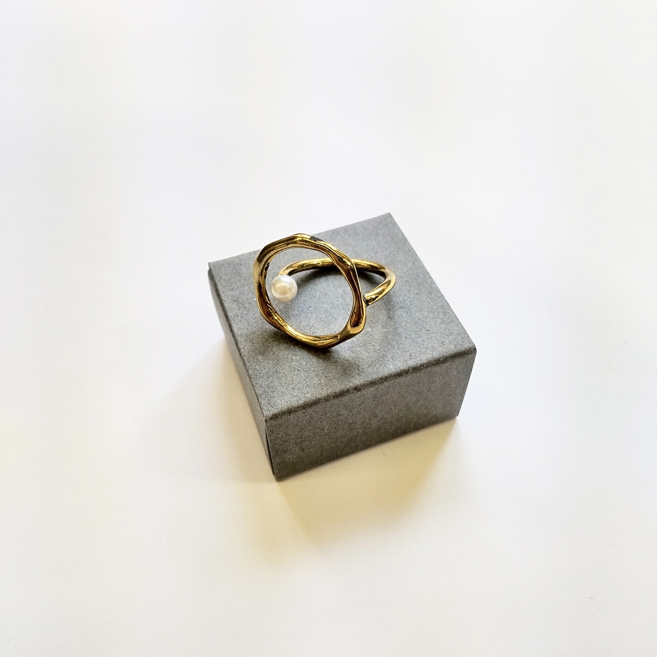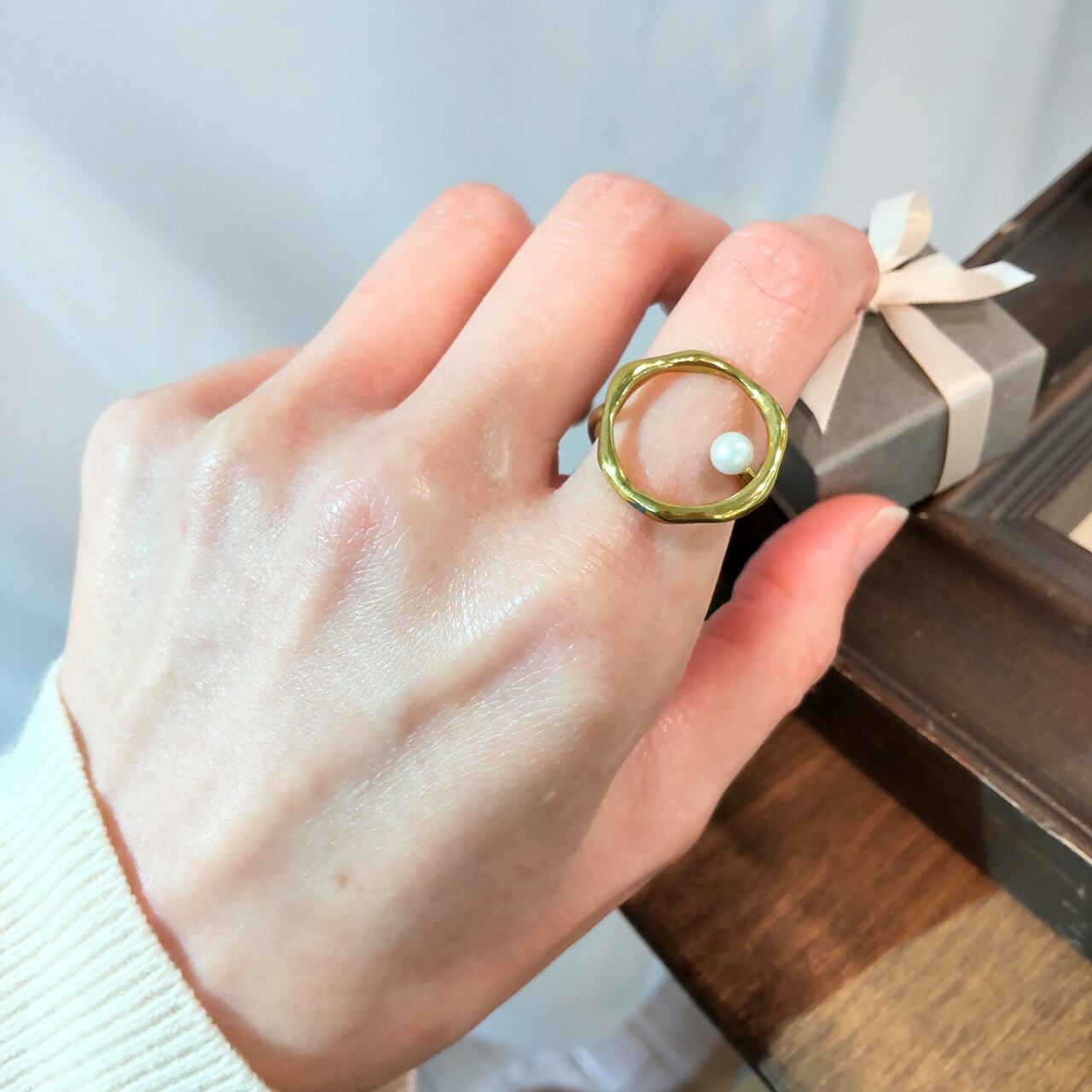 波うった輪っかの中に一粒のあこやパールがちょこんと顔を出したリング。