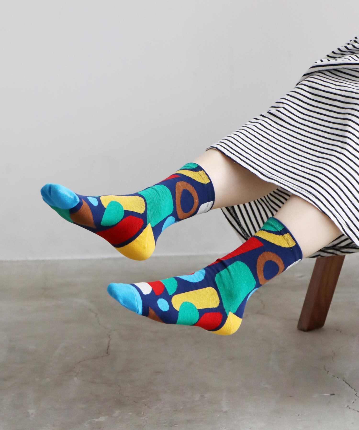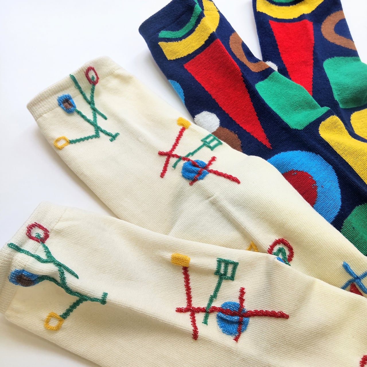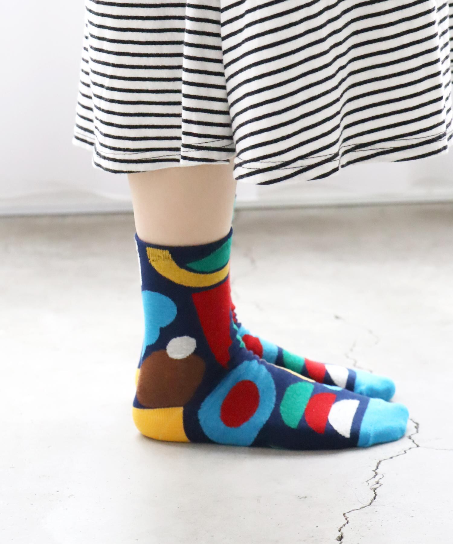 不思議な模様の靴下。よく見ると〇△□が描かれていてとっても楽しそう。