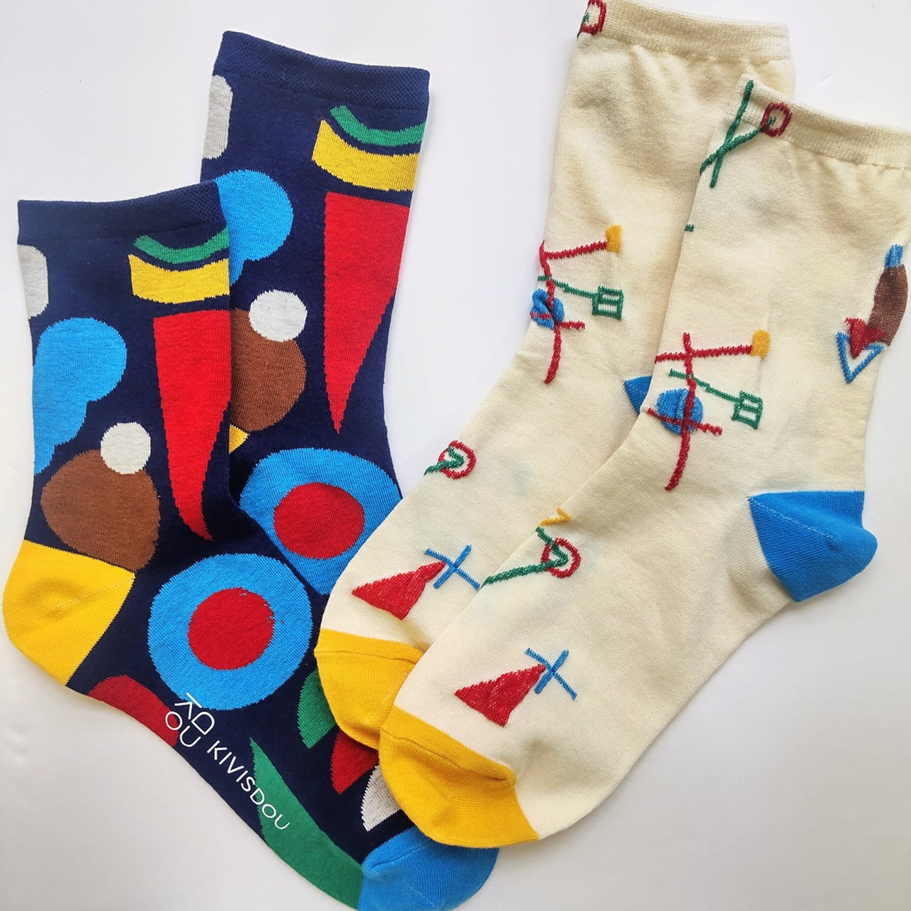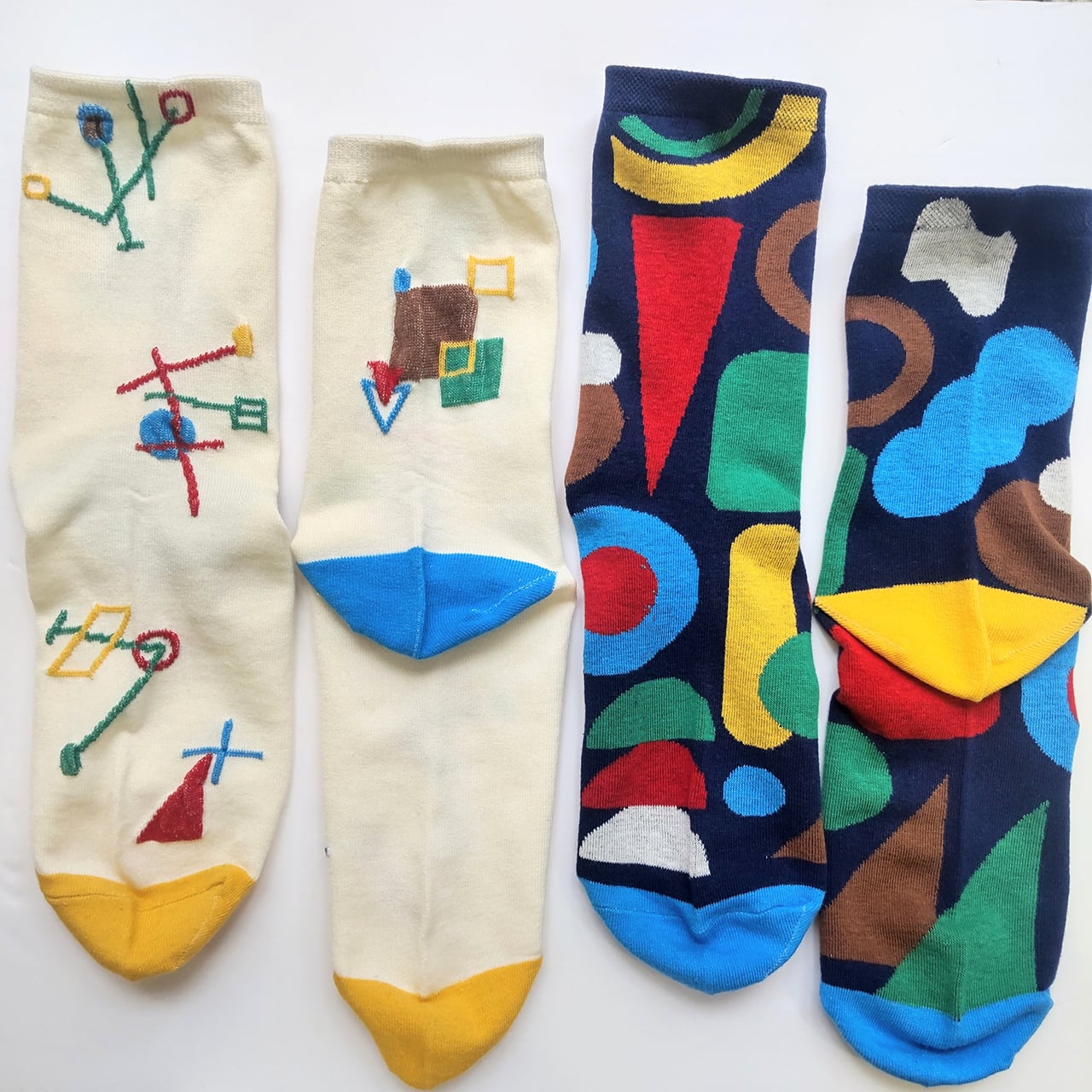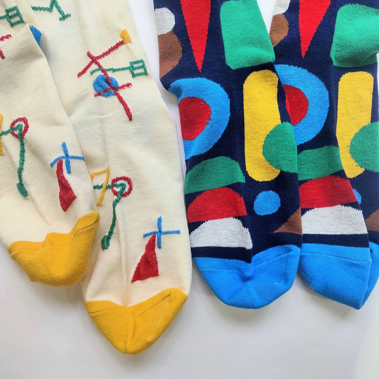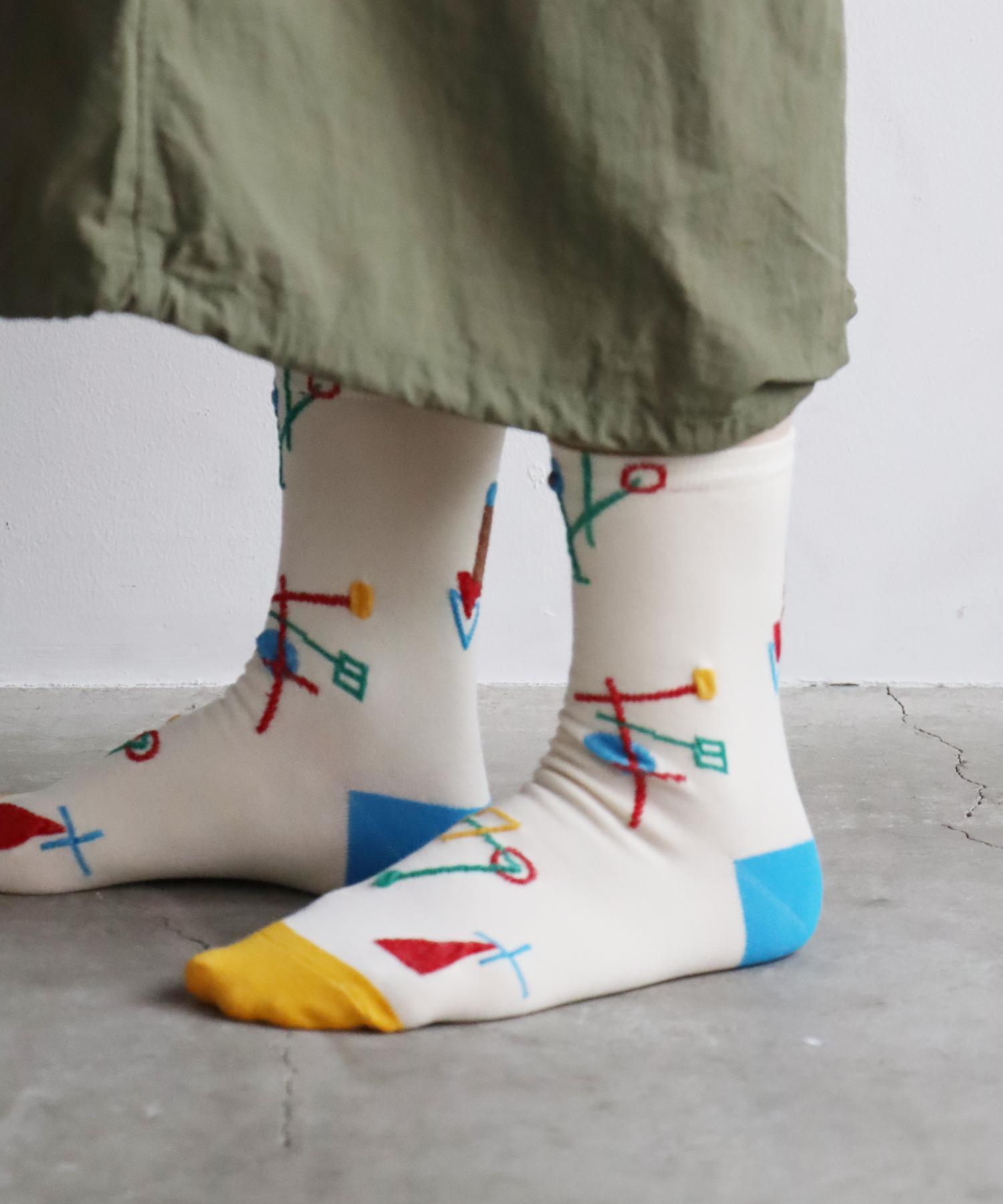 不思議な模様の靴下。よく見ると〇△□が描かれていてとっても楽しそう。
