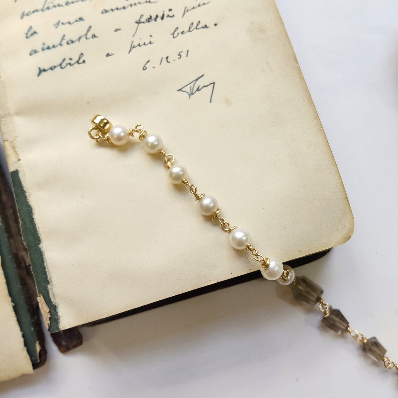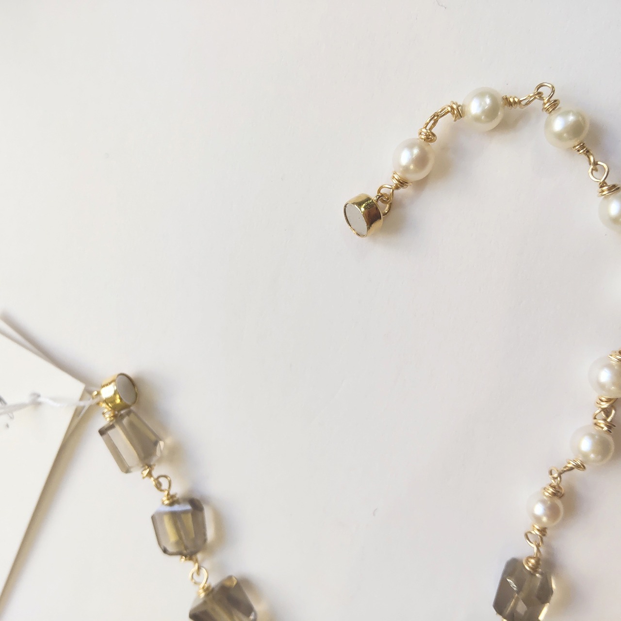 スモーキークオーツと淡水パールが半分ずつ並んでおり