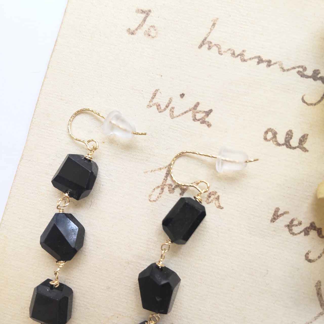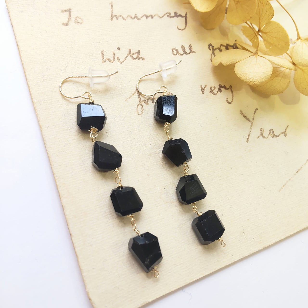 スブラックトルマリンが連なった、とてもシックな雰囲気でかっこいいピアス。