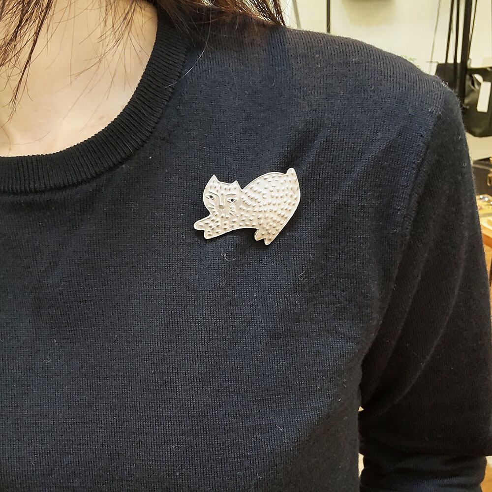 銀彩ブローチなので可愛さの中にもどこかクールな印象です。