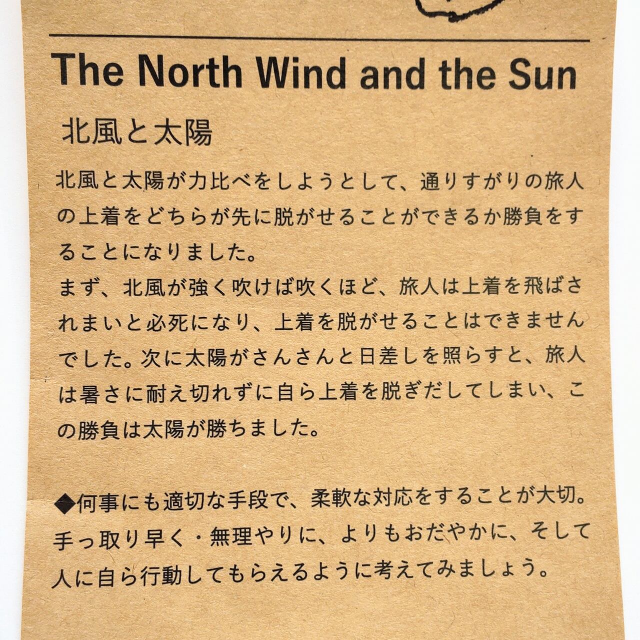 まず、北風が強く吹けば吹くほど、旅人は上着を飛ばされまいと必死になり、上着を脱がせることはできませんでした。 次に太陽がさんさんと日差しを照らすと、旅人は暑さに耐え切れずに自ら上着を脱ぎだしてしまい、この勝負は太陽が勝ちました。
