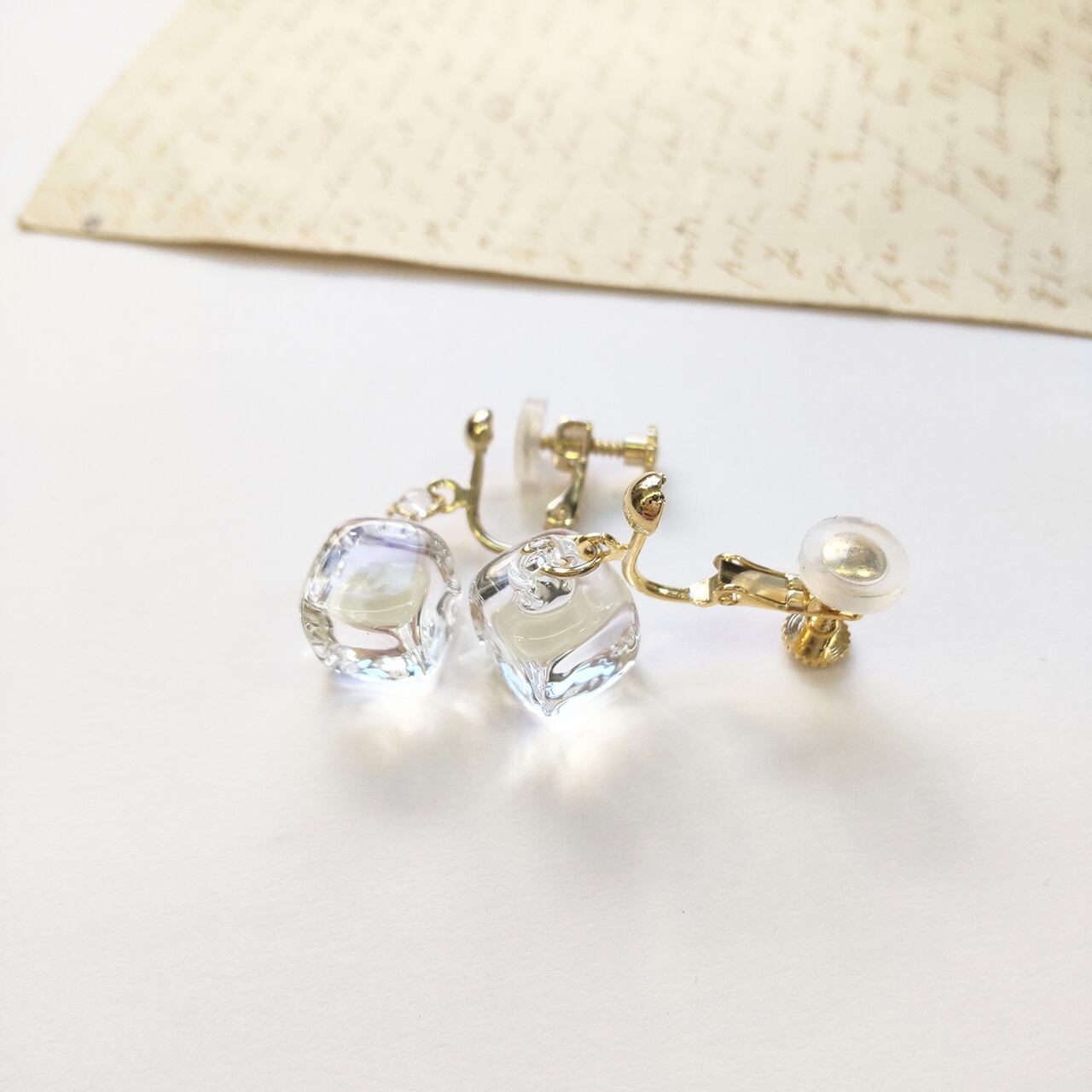 ひんやり冷たい溶けない氷のようなcubeピアスとイヤリング。